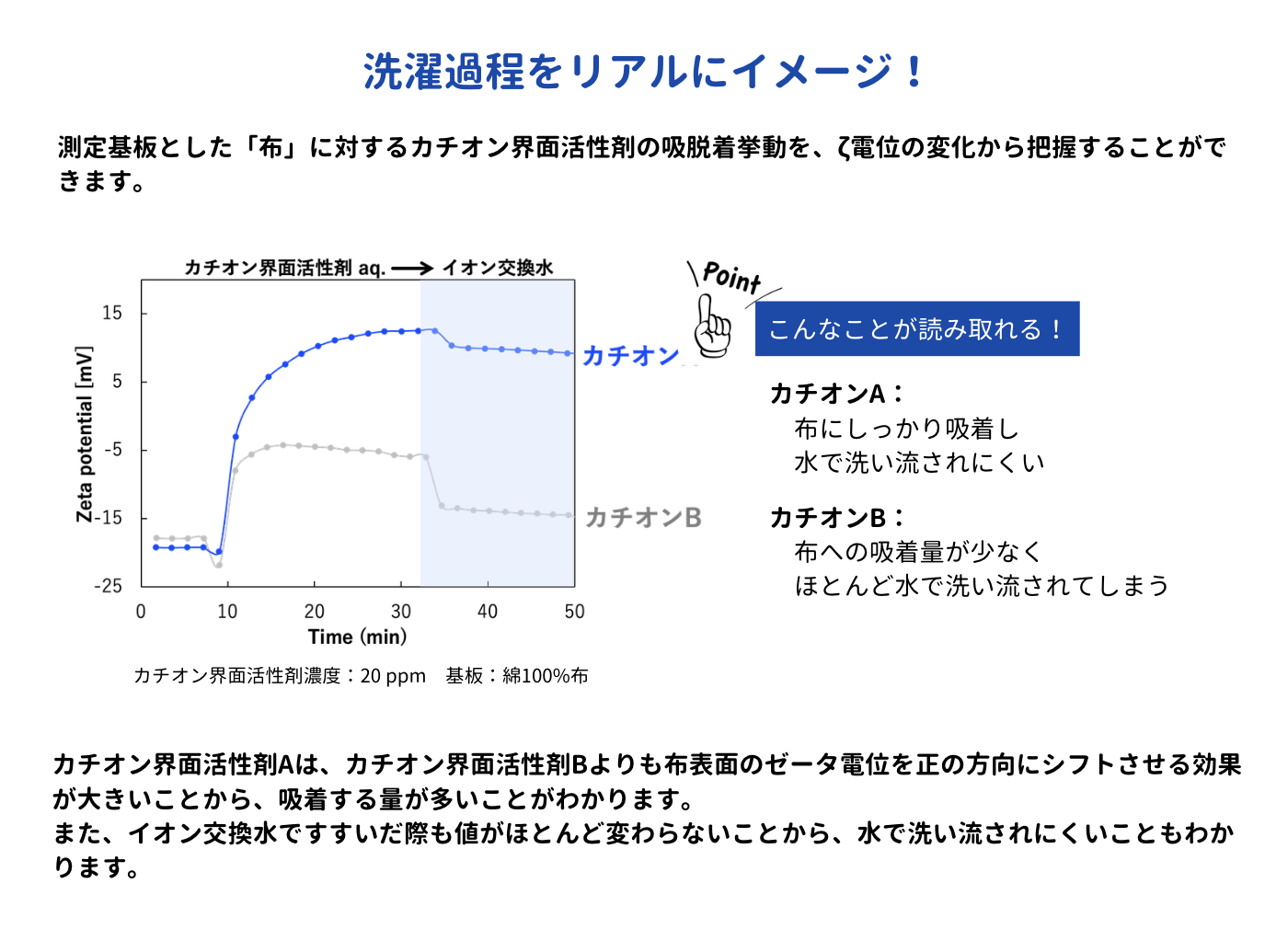測定基板に布を使用し、固体表面ゼータ電位計でカチオン界面活性剤A、Bの表面電位を測定することで柔軟剤中の界面活性剤の働きをイメージすることができます。