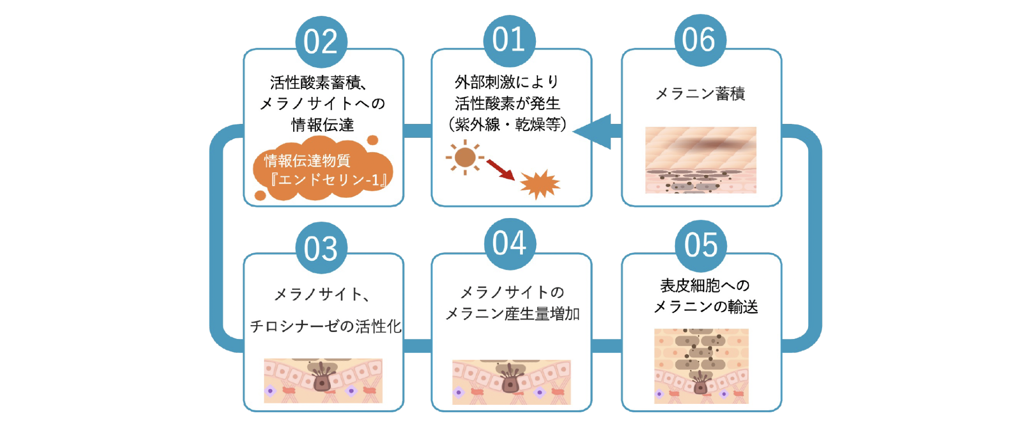 表⽪細胞から放出されるメラノサイト活性化因⼦として、プロスタグランジンE2(PGE2)やエンドセリン-1(ET-1)などが知られています。また、インターロイキン 1α(IL-1α)は表⽪細胞から放出され、表⽪細胞にオートクライン的に作⽤することにより、ET-1 放出を促進することが知られています。