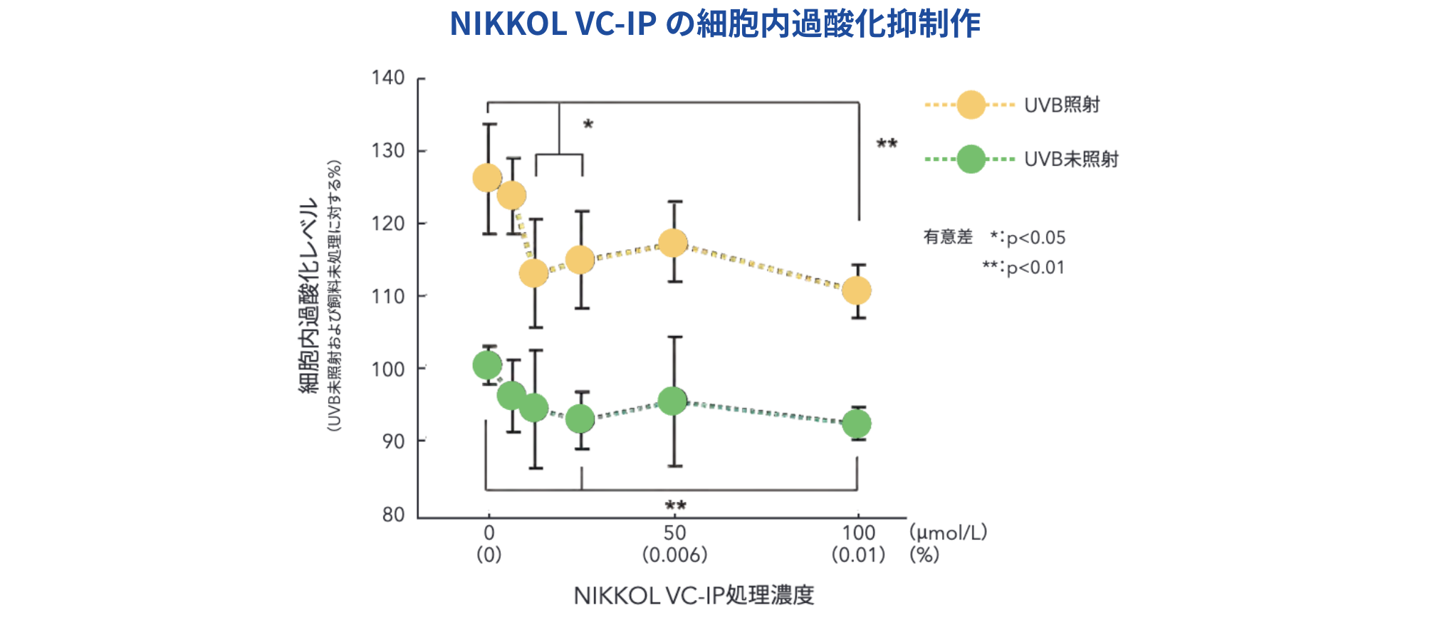NIKKOL VC-IP を24時間処理したヒト表⽪細胞にUVBを照射し、その後の細胞内過酸化レベルを、ジヒドロローダミン123(DHR123)を⽤いて測定しました。 その結果、NIKKOL VC-IP に、UVB による細胞内過酸化レベルの増加を抑制する作⽤が認められました。