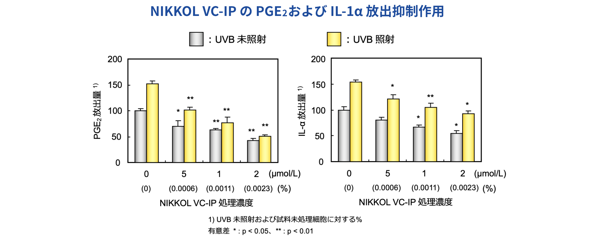 そこで、紫外線によるPGE2およびIL-1α放出に対するNIKKOL VC-IP の作⽤を評価するため、各濃度のNIKKOL VC-IPを24時間処理したヒト表⽪細胞に紫外線を照射し、培養上清中のPGE2およびIL-1α量を酵素抗体法により検出しました。その結果、NIKKOL VC-IPは、表⽪細胞からのPGE2およびIL-1αの放出を抑制することがわかりました。