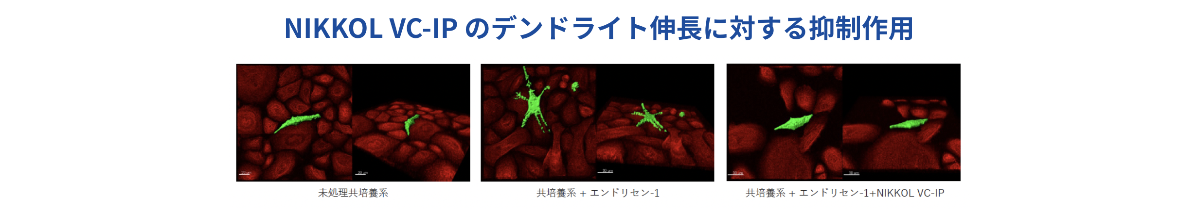 正常ヒト表⽪細胞と正常ヒト⾊素細胞に、エンドセリン-1(ET-1)とNIKKOL VC-IPを添加し、共焦点レーザー顕微鏡で観察した結果、NIKKOL VC-IPは⾊素細胞のデンドライトの伸⻑を抑制することが確認されました。