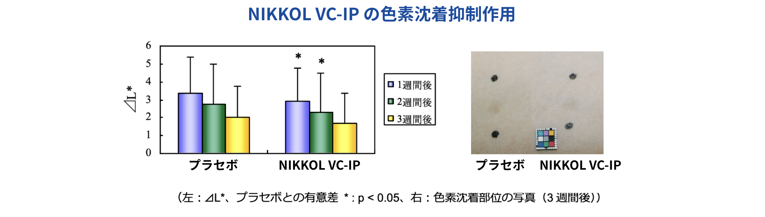 ヒト上腕内側に紫外線(UVAおよびUVB)をソーラーシミュレーターにて照射し、照射直後からNIKKOL VC-IP配合製剤とプラセボ製剤をそれぞれの塗布部位に3週間連続塗布。1週間毎に⽪膚⾊ (明度︓L*値)を測定し、⊿L*(= 紫 外線照射前のL*-紫外線照射後のL*)を用いて⾊素沈着の程度を評価しました。 その結果、プラセボ製剤塗布部位と⽐較して、NIKKOL VC-IP配合製剤塗布部位では⊿L*が 有意に低く、⾊素沈着が抑制されていることが確認されました。