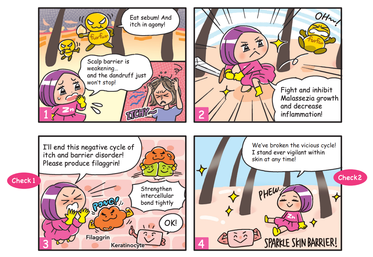NIKKOL Zinc-Glycine Complex improves dandruff by restoring the barrier function of the scalp, as evidenced by amplifying the expression of epidermal filaggrin.