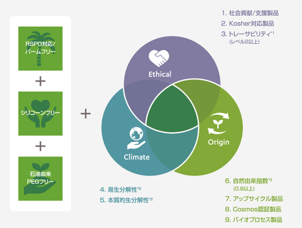 RSPOやPEGフリーなどの必須条件に加え、倫理・環境・由来の3区分で日光ケミカルズが定義した環境配慮型製品を紹介します。
