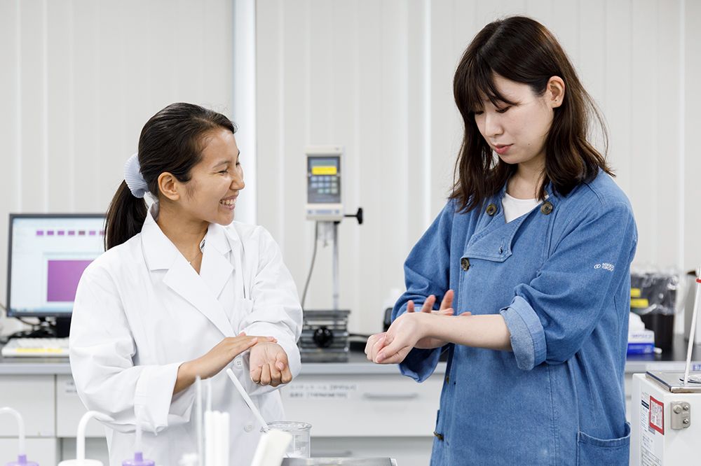 Our open research laboratory is available for our customers to learn emulsification, dispersion, solubilization technology, and basic cosmetic technologies ranging from skincare to make-up. We also help create new products through developmental efforts with our customers.